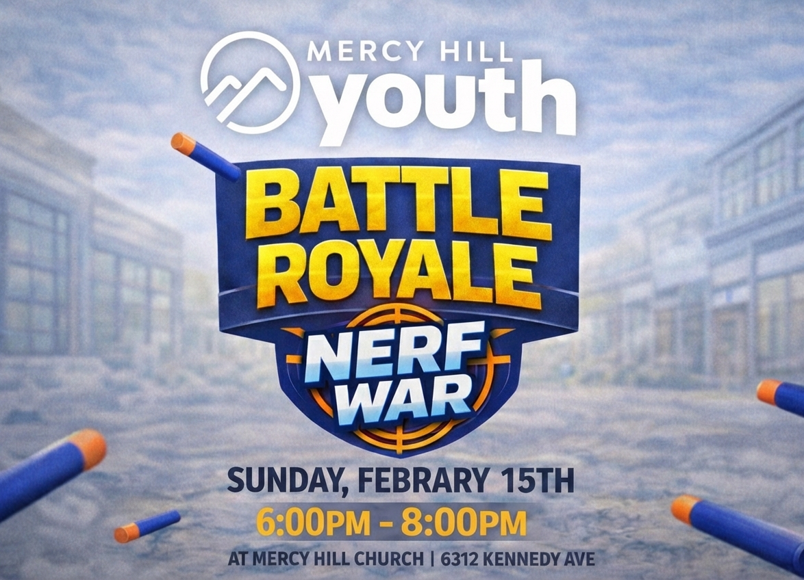 Join us on Sunday, February 15th from 6–8pm at Mercy Hill Church for an epic night of Nerf battles, team challenges, and all-out fun! We’ll transform the space into a battleground where strategy, speed, and teamwork matter. Whether you’re dodging darts or leading your squad to victory, this is a night you don’t want to miss. Bring your friends, wear athletic clothes, and come ready for action!